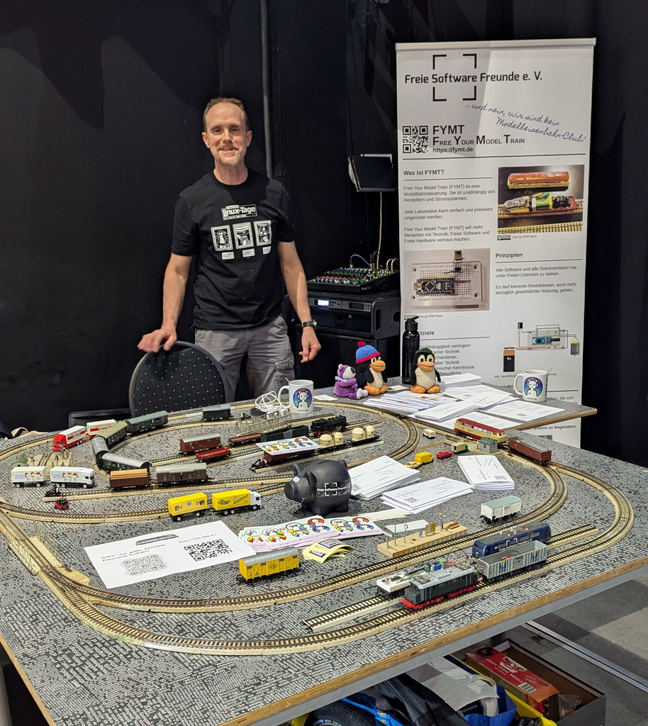 Am Stand der Freien Software Freunde präsentierten wir wieder mit einer Anlage unser Projekt FYMT. Dabei konnten wir vor allem erklären, dass wir kein Modellbahn-Verein sind und wozu wir dieses Projekt nutzen. Es kam zu einigen sehr guten Gesprächen.