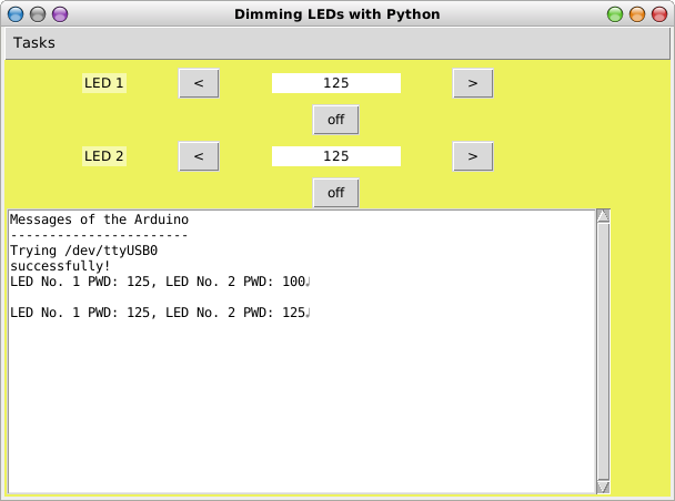 Die Methode "dia" erzeugt den oben abgebildeten Dialog. Unter dem Menüpunkt "Tasks" befinden sich die Unterpunkte "Connect to Arduino", "Arduino info" und "Close".
