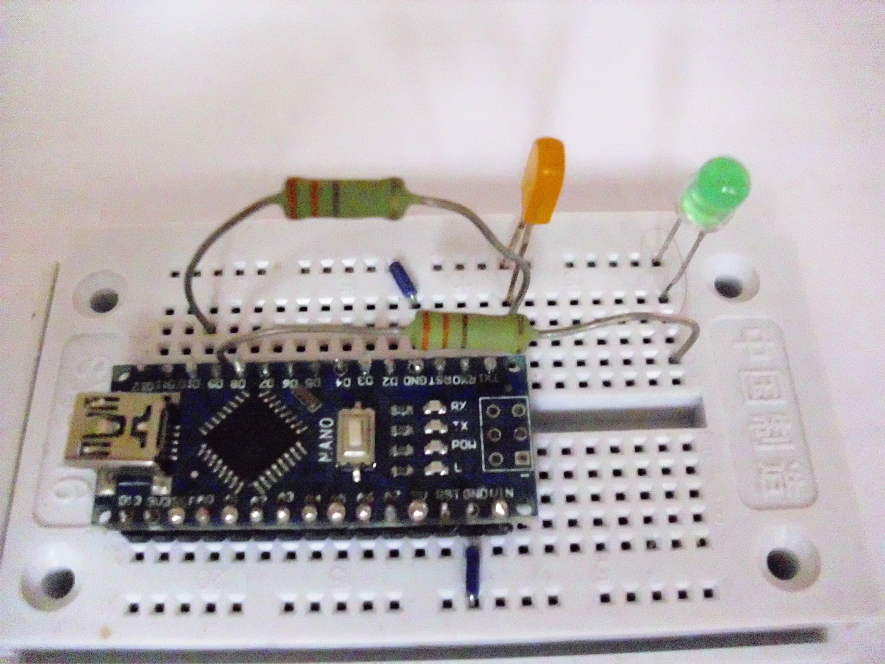 Der simple Aufbau erfolgte auf einer Steckplatine (breadboard). Zwei LED werden jeweils über einen Widerstand mit den Pins D9 und D10 verbunden. Die Stromversorgung erfolgt über die USB-Schnittstelle.