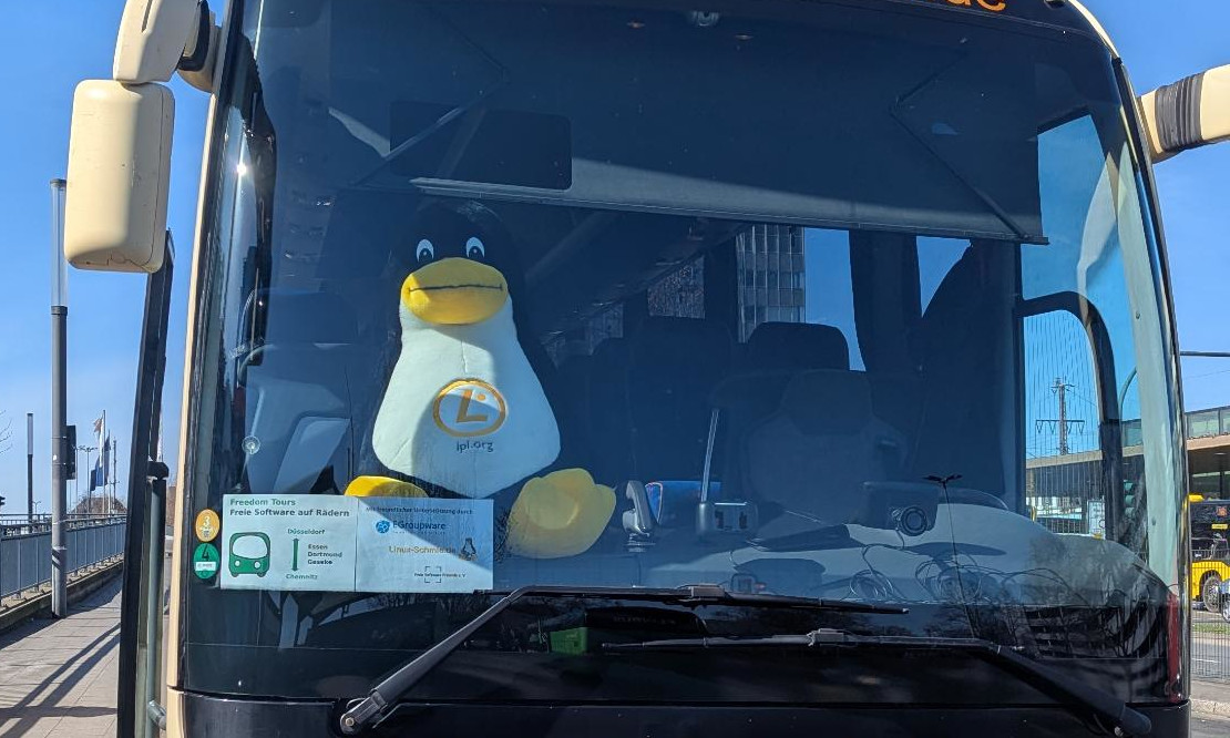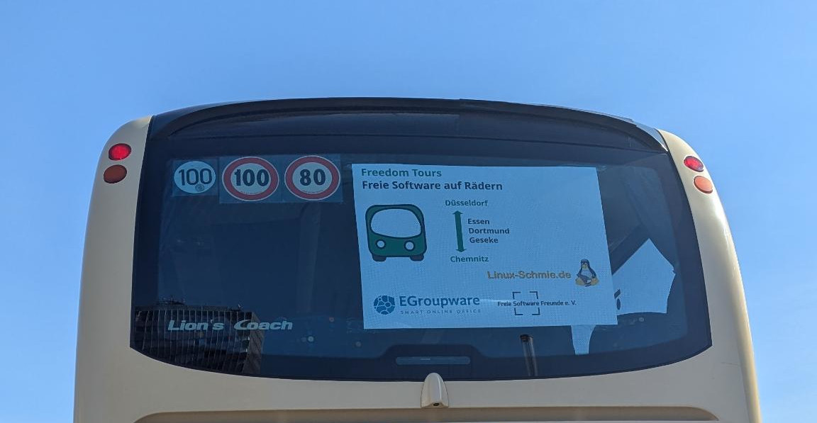 Mit dem Freedom-Tours-Bus kann man vom Rheinland durch das Ruhrgebiet zu den Chemnitzer Linux-Tagen reisen. Dabei spart man sich nicht nur selbst eine lange Autofahrt, man kann sich auch bereits auf der Fahrt mit anderen Teilnehmenden austauschen. Auch die Mitnahme von Standmaterial ist insbesondere für Aussteller mit dem Bus kein Problem.